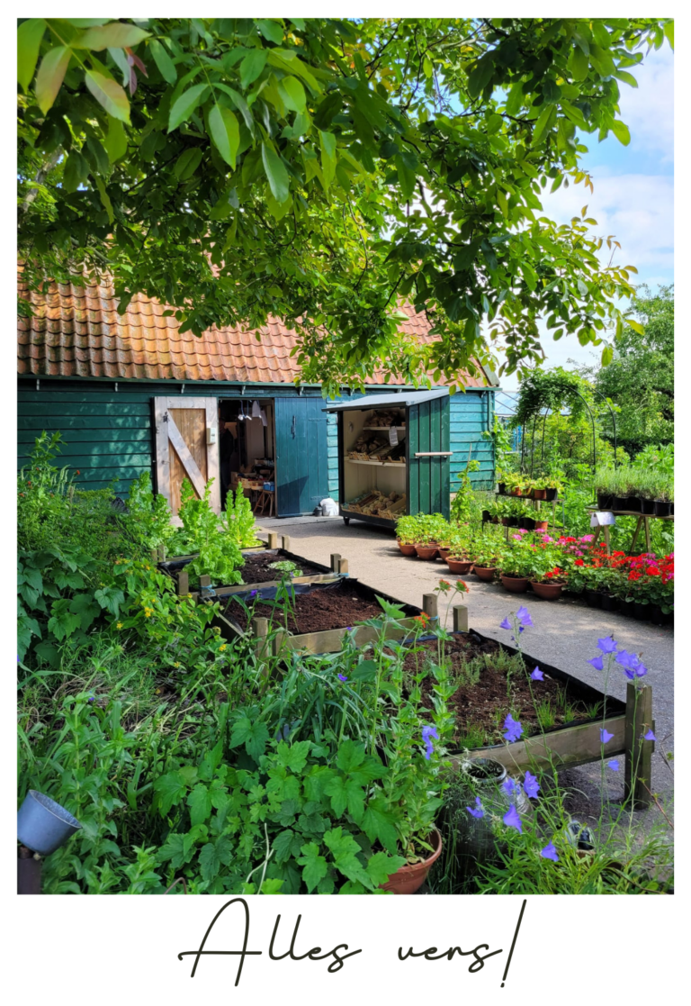 In de grote schuur en de kas wordt hard gewerkt. Daar potten we planten op, timmeren, schilderen, selecteren we de groente en doen allerlei klussen die niet in de huistuinkamer gedaan kunnen worden.